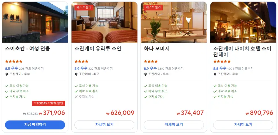 조칸케이료칸 스이초칸(Suichokan)의 최저 가격대는 아고다웹사이트에서 할인특가 가격으로 매일매일 변동되며 10만원대부터 다양하게 형성됩니다. 날짜별로 매일 가격이 다르므로 아고다웹사이트 최저가를 확인하시려면 아래 링크를 누르시고 원하는 날짜의 가격대를 선택해야 정확한 가격을 자세히 보실 수 있습니다.