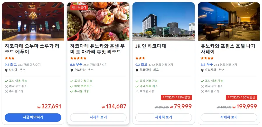 하코다테 오누마 쓰루가 리조트 에푸이 (Hakodate Onuma Tsuruga Resort EPUY)의 최저 가격대는 아고다웹사이트에서 할인특가 가격으로 매일매일 변동되며 10만원대부터 다양하게 형성됩니다. 날짜별로 매일 가격이 다르므로 아고다웹사이트 최저가를 확인하시려면 아래 링크를 누르시고 원하는 날짜의 가격대를 선택해야 정확한 가격을 자세히 보실 수 있습니다.