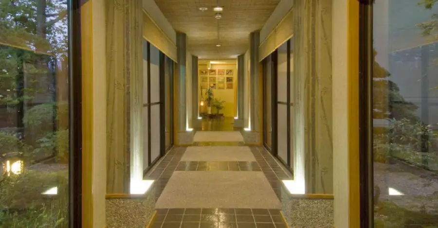 버스 터미널에서 역까지 도보 거리. 꽤 오래된 건물임에도 불구하고 잘 관리된 건물입니다. 우리는 야외 전용 온천을 위해 이 료칸을 선택했습니다.
