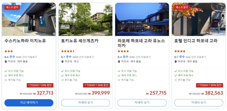 하코네료칸 수스키노하라 이치노유 (Susukinohara Ichinoyu) 료칸의 최저 가격대는 아고다웹사이트에서 할인특가 가격으로 매일매일 변동되며 10만원대부터 다양하게 형성됩니다. 날짜별로 매일 가격이 다르므로 아고다웹사이트 최저가를 확인하시려면 아래 링크를 누르시고 원하는 날짜의 가격대를 선택해야 정확한 가격을 자세히 보실 수 있습니다.