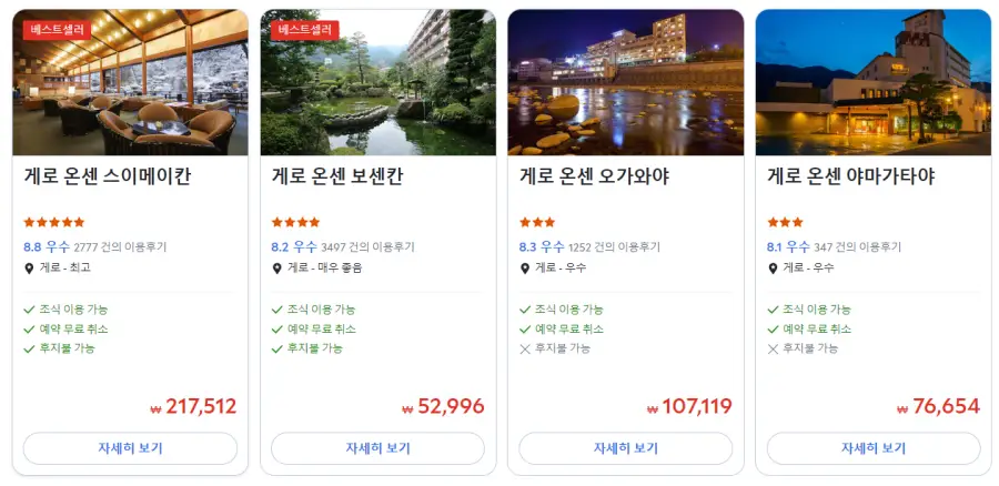 게로온천마을 료칸 가이세키야도 스이호엔 (Suihoen)의 최저 가격대는 아고다웹사이트에서 할인특가 가격으로 매일매일 변동되며 10만원대부터 다양하게 형성됩니다. 날짜별로 매일 가격이 다르므로 아고다웹사이트 최저가를 확인하시려면 아래 링크를 누르시고 원하는 날짜의 가격대를 선택해야 정확한 가격을 자세히 보실 수 있습니다.
