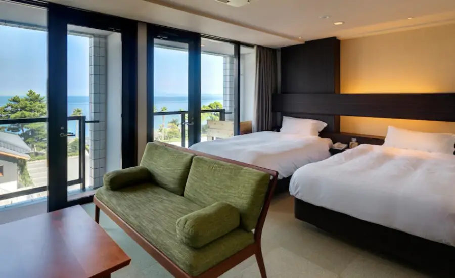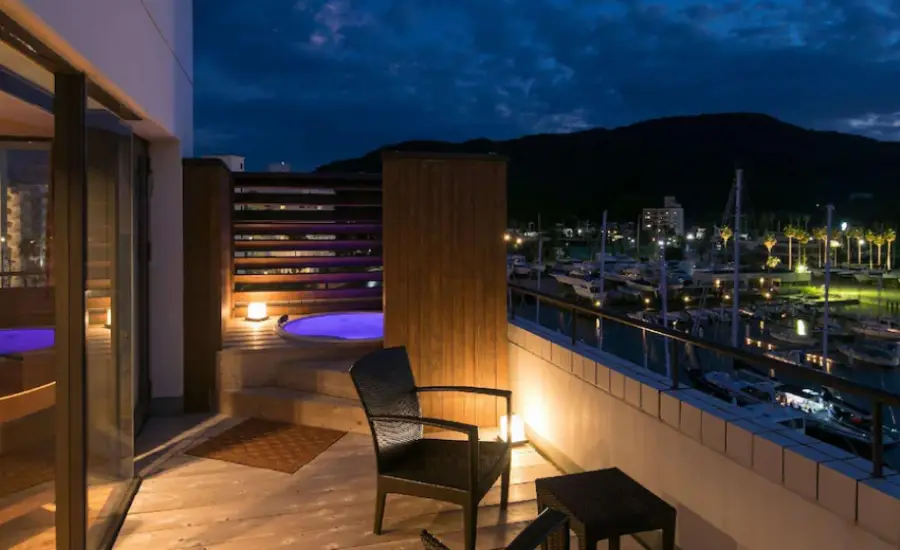 가격은 조금 높았지만 우리 방은 개인 온천이 있는 훌륭한 항구 전망을 즐겼습니다. 호텔에는 마사지 의자, 발 핫 스톤과 함께 공용 온천이 마련되어 있습니다. 위치는 꽤 멀기 때문에 자동차로 여행하는 경우에만 권장됩니다.