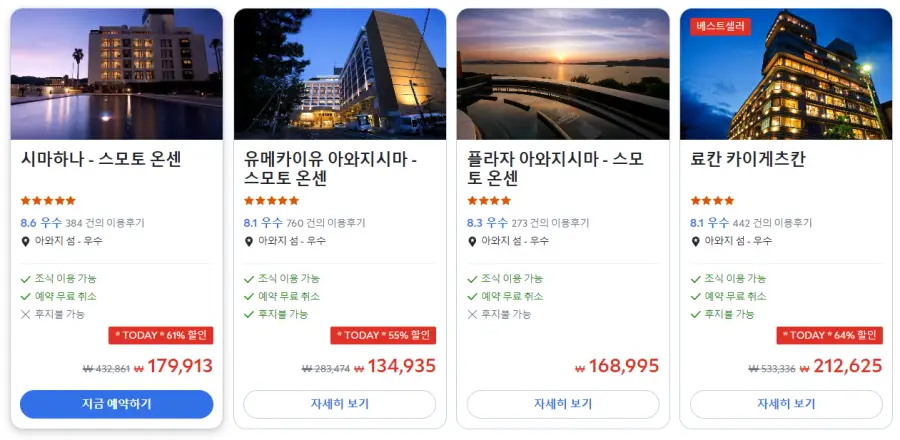 시마하나 스모토 온센 (Shimahana Sumoto Onsen)의 최저 가격대는 아고다웹사이트에서 할인특가 가격으로 매일매일 변동되며 10만원대부터 다양하게 형성됩니다. 날짜별로 매일 가격이 다르므로 아고다웹사이트 최저가를 확인하시려면 아래 링크를 누르시고 원하는 날짜의 가격대를 선택해야 정확한 가격을 자세히 보실 수 있습니다.