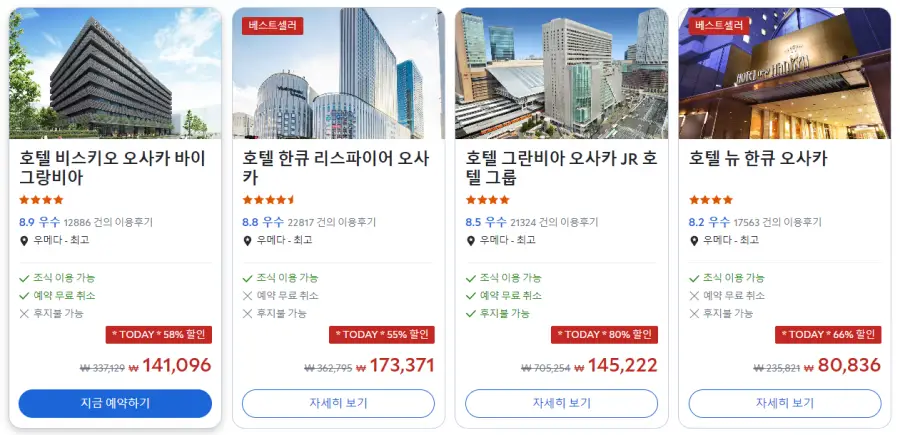 오사카역근처 호텔 비스키오 오사카 바이 그랑비아 (HOTEL VISCHIO OSAKA by GRANVIA)의 최저 가격대는 아고다웹사이트에서 할인특가 가격으로 매일매일 변동되며 10만원대부터 다양하게 형성됩니다. 날짜별로 매일 가격이 다르므로 아고다웹사이트 최저가를 확인하시려면 아래 링크를 누르시고 원하는 날짜의 가격대를 선택해야 정확한 가격을 자세히 보실 수 있습니다.
