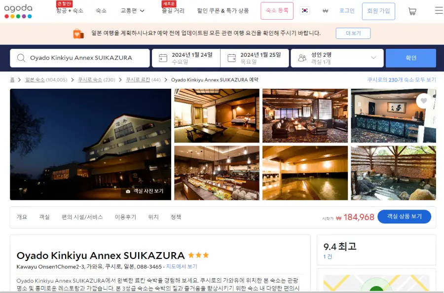 홋카이도 가와유 온천 오야도 킨키유 아넥스 수이카즈라(Oyado Kinkiyu Annex SUIKAZURA)의 최저 가격대는 아고다웹사이트에서 할인특가 가격으로 매일매일 변동되며 10만원대부터 다양하게 형성됩니다. 날짜별로 매일 가격이 다르므로 아고다웹사이트 최저가를 확인하시려면 아래 링크를 누르시고 원하는 날짜의 가격대를 선택해야 정확한 가격을 자세히 보실 수 있습니다.