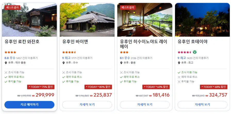 유후인 료칸 와잔호 (Yufuin Ryokan Wazanho)의 최저 가격대는 아고다웹사이트에서 할인특가 가격으로 매일매일 변동되며 10만원대부터 다양하게 형성됩니다. 날짜별로 매일 가격이 다르므로 아고다웹사이트 최저가를 확인하시려면 아래 링크를 누르시고 원하는 날짜의 가격대를 선택해야 정확한 가격을 자세히 보실 수 있습니다.