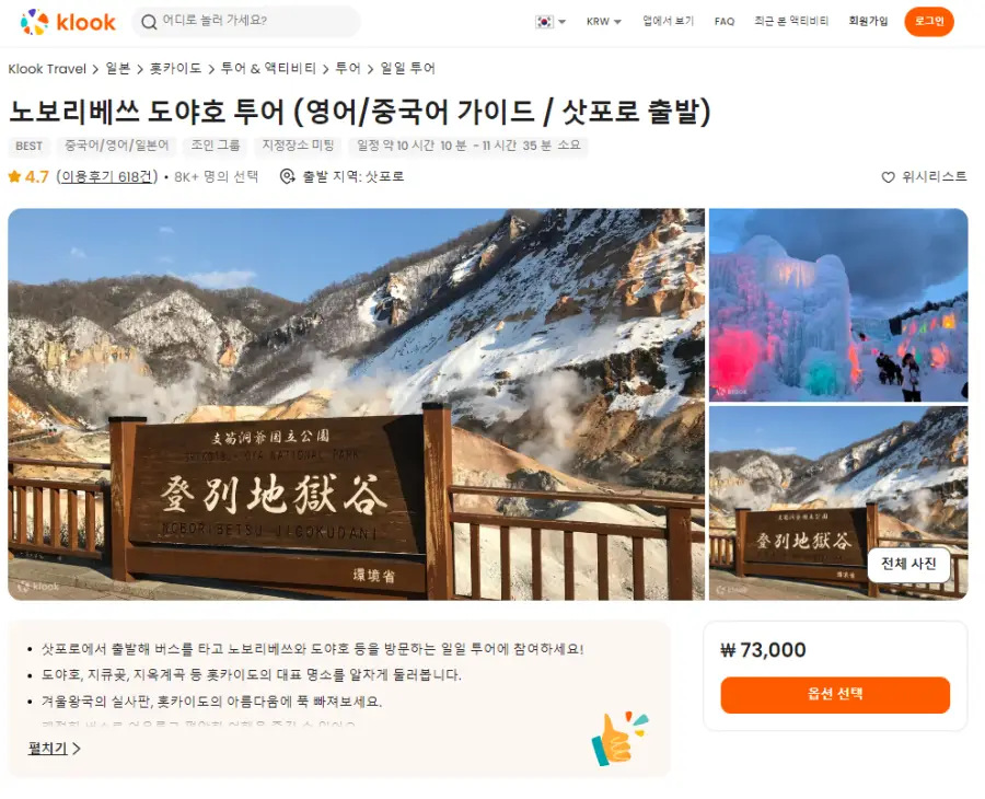 삿포로출발 노보리베쓰 지큐곶, 지옥계곡과 도야호 투어는 클룩사이트에서 쉽게 예약하실 수 있으며, 현재 할인된 금액에 이용하실 수 있습니다. 내용 및 요금은 항상 변경될 수 있으니 예약사이트에서 정확한 내용을 확인하셔야 합니다.