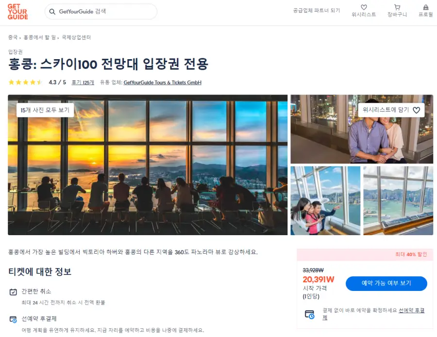 홍콩 스카이100 전망대 입장권은 GET YOUR GUIDE 사이트에서 예약하실 수 있습니다. 사이트는 특히 전세계 대부분의 나라, 지역의 투어, 교통편 있어, 쉽게 찾을 수 없는 여행지의 다양한 투어 및 서비스를 이용할 수 있는 글로벌 사이트로 한국어사이트는 지원하지 않습니다. (글로벌 한국어 여행사이트를 찾으신다면 klook 여행사이트 추천합니다. 함께 사용하시면 더욱 편하게 여행하실 수 있습니다. klook에 찾는 정보가 없다면 GET YOUR GUIDE에서 찾으시면 됩니다.)
