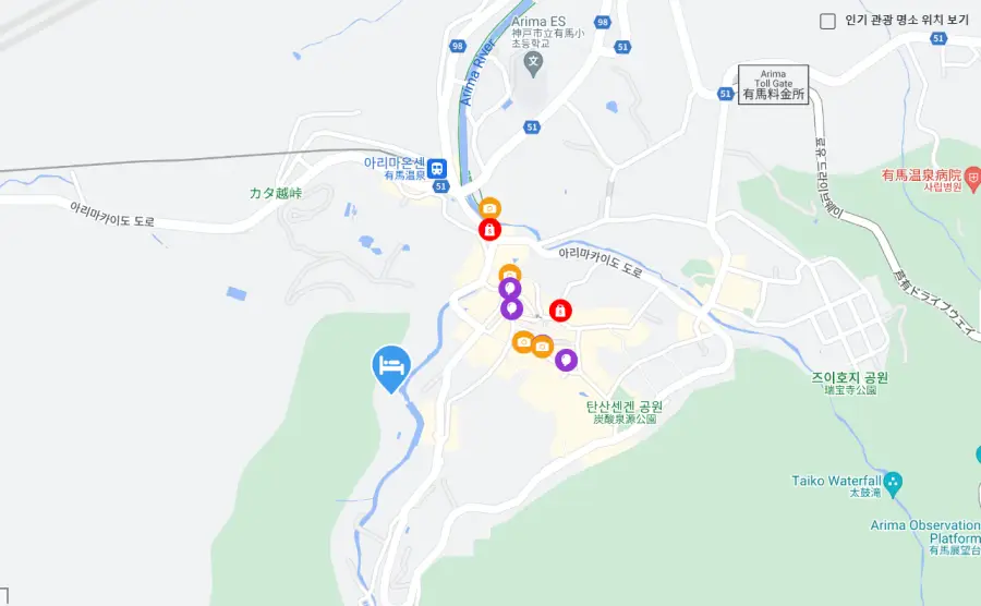 아리마 온천: 당연히 가장 대표적인 관광 명소는 아리마 온천 자체입니다. 일본에서 가장 오래된 온천으로 알려진 이곳에서는 황금온천과 은온천을 즐길 수 있습니다.