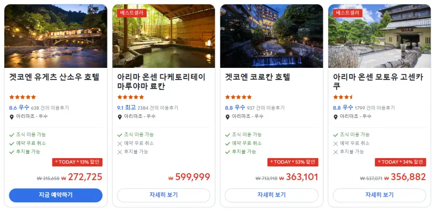 아리마료칸 겟코엔 유게츠 산소우 호텔 (Gekkoen Yugetsusanso Hotel)의 최저 가격대는 아고다웹사이트에서 할인특가 가격으로 매일매일 변동되며 10만원대부터 다양하게 형성됩니다. 날짜별로 매일 가격이 다르므로 아고다웹사이트 최저가를 확인하시려면 아래 링크를 누르시고 원하는 날짜의 가격대를 선택해야 정확한 가격을 자세히 보실 수 있습니다.