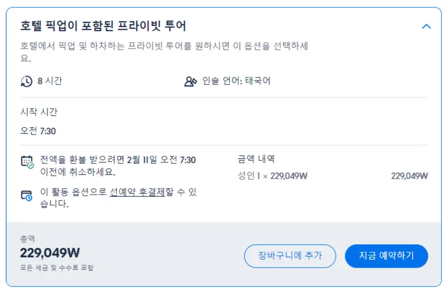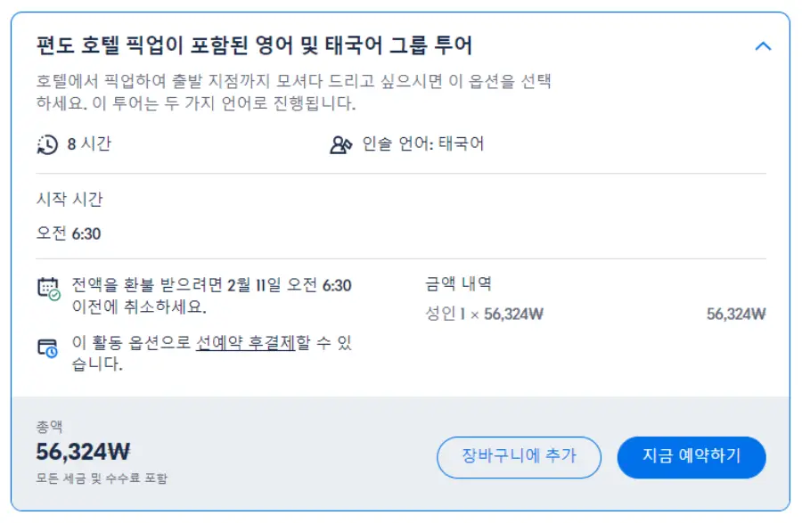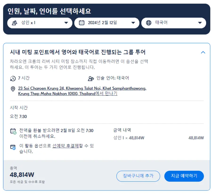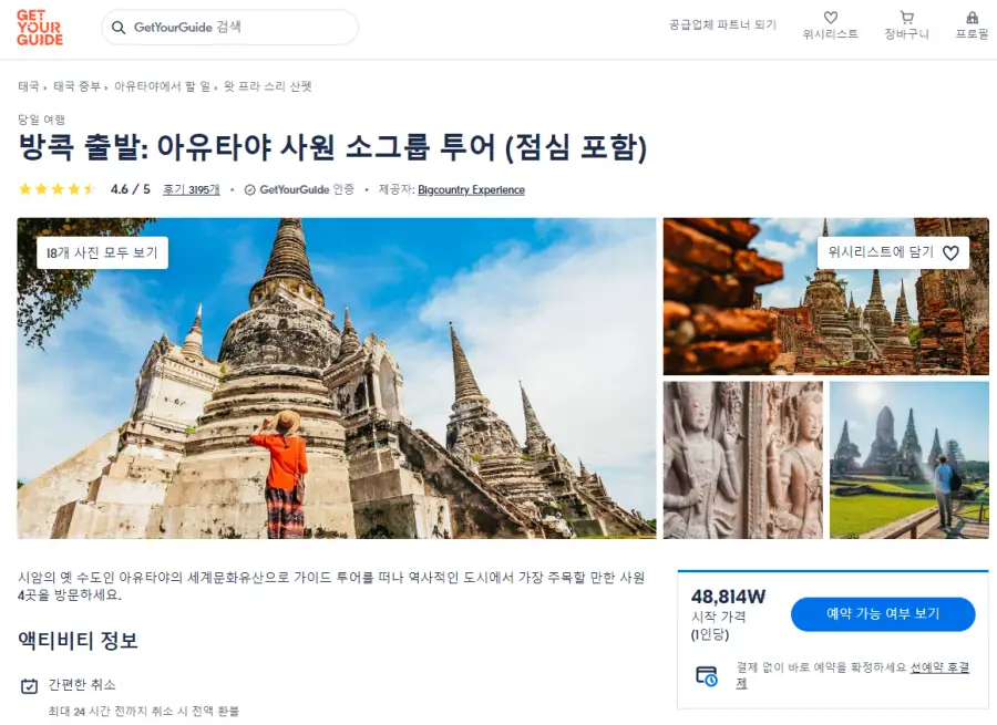 방콕에서 출발하는 아유타야 소규모 현지투어는 GET YOUR GUIDE 사이트에서 예약하실 수 있습니다. 사이트는 특히 전세계 대부분의 나라, 지역의 투어, 교통편 있어, 쉽게 찾을 수 없는 여행지의 다양한 투어 및 서비스를 이용할 수 있는 글로벌 사이트로 한국어사이트는 지원하지 않습니다. (글로벌 한국어 여행사이트를 찾으신다면 klook 여행사이트 추천합니다. 함께 사용하시면 더욱 편하게 여행하실 수 있습니다. klook에 찾는 정보가 없다면 GET YOUR GUIDE에서 찾으시면 됩니다.)