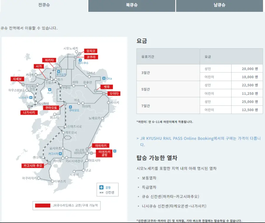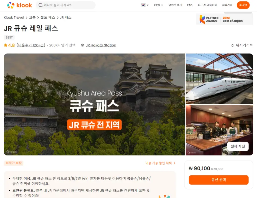JR 큐슈 레일 패스, 전지역 레일 패스, 북큐슈 레일 패스, 남큐슈 레일 패스는 클룩사이트에서 쉽게 예약하실 수 있으며, 현재 할인된 금액에 이용하실 수 있습니다. 내용 및 요금은 항상 변경될 수 있으니 예약사이트에서 정확한 내용을 확인하셔야 합니다.