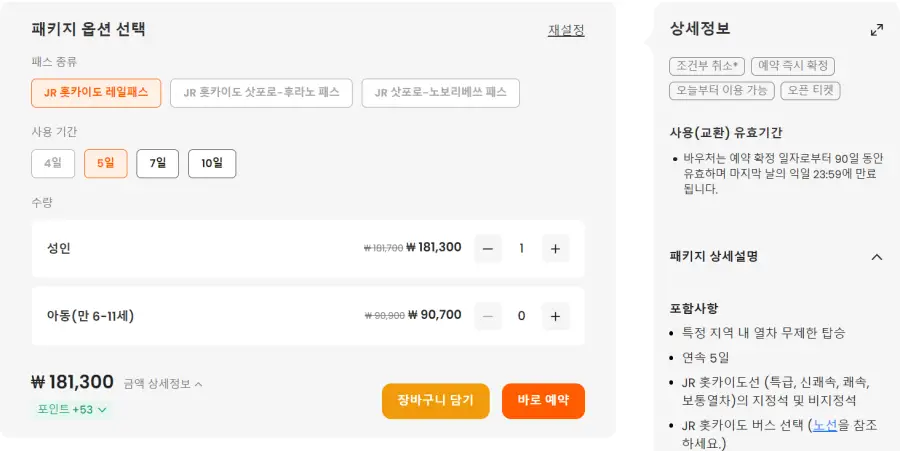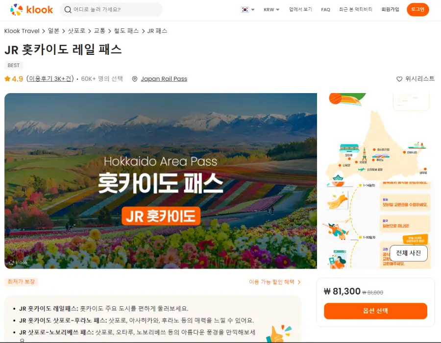 JR 홋카이도 레일 패스는 클룩사이트에서 쉽게 예약하실 수 있으며, 현재 할인된 금액에 이용하실 수 있습니다. 내용 및 요금은 항상 변경될 수 있으니 예약사이트에서 정확한 내용을 확인하셔야 합니다.