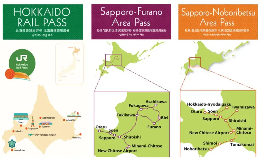 JR 삿포로-노보리베쓰 에리어 패스: 이 패스는 삿포로와 노보리베쓰 지역의 JR 노선을 3일 동안 무제한으로 이용할 수 있습니다. 가격은 홋카이도 레일 패스보다 저렴하며, 삿포로와 노보리베쓰 지역을 중점적으로 여행하려는 분들에게 적합합니다.