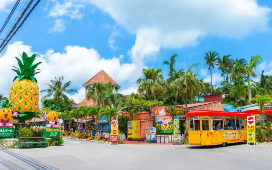 오키나와 나고 파인애플 파크: 이곳은 파인애플 열차를 타고 파인애플 농장을 돌아보며, 다양한 종류의 파인애플을 맛보고 구매할 수 있는 곳입니다.