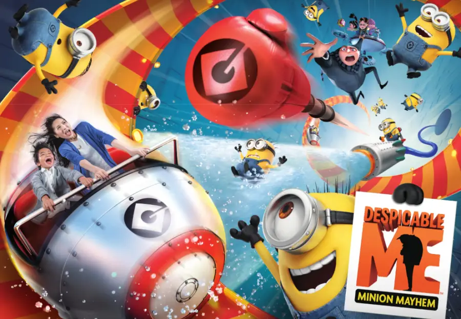 미니언 메이햄 : 이 어트랙션은 미니언들의 세계를 체험할 수 있는 라이드입니다. 참가자들은 미니언들과 함께 다양한 장난과 모험을 즐길 수 있습니다.
