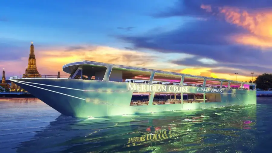 메르디앙 디너 크루즈는 방콕에서 가장 유명한 디너 크루즈 중 하나로, 특히 그 고급스러운 분위기와 훌륭한 서비스로 알려져 있습니다. 이 크루즈에서는 샤오프라야 강을 따라 이동하면서 아름다운 방콕의 야경을 감상할 수 있습니다. 메르디앙 디너 크루즈는 다양한 요리를 선보이는데, 태국 음식뿐만 아니라 서양 음식도 준비되어 있어 다양한 맛을 즐길 수 있습니다.