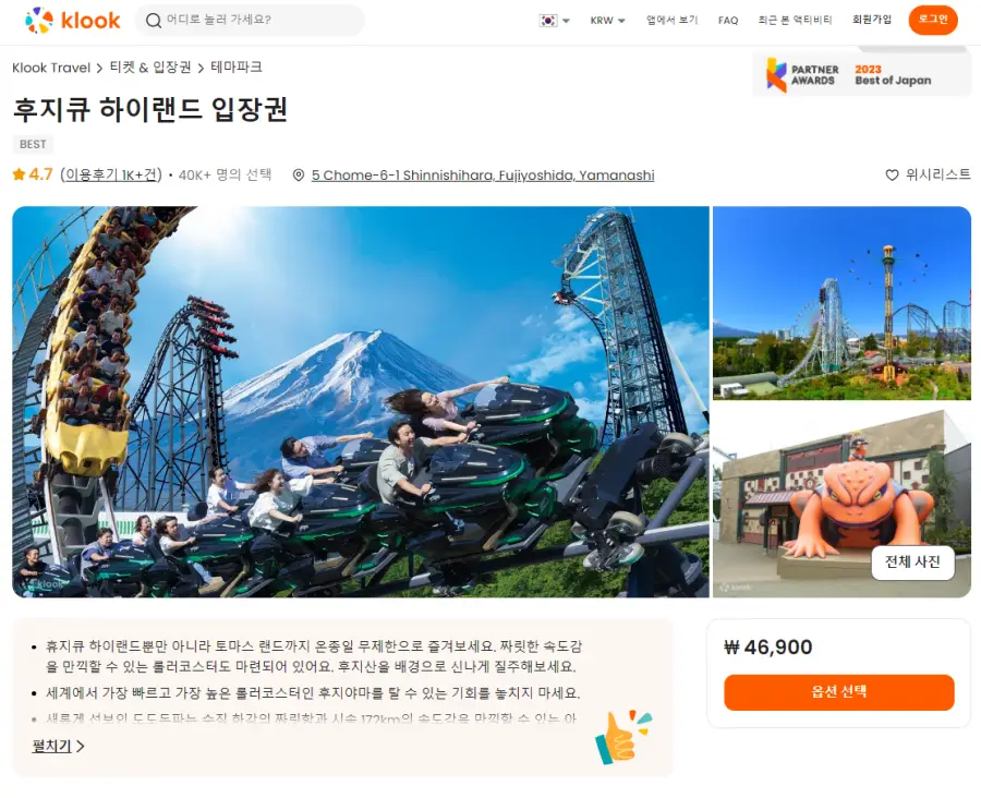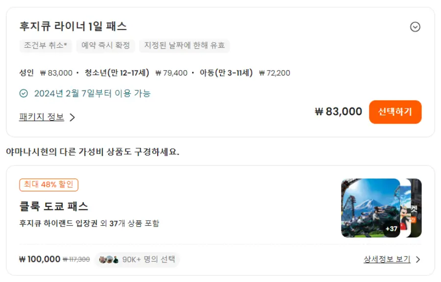 후지큐 하이랜드 입장권은 클룩사이트에서 쉽게 예약하실 수 있으며, 현재 할인된 금액에 이용하실 수 있습니다. 내용 및 요금은 항상 변경될 수 있으니 예약사이트에서 정확한 내용을 확인하셔야 합니다.