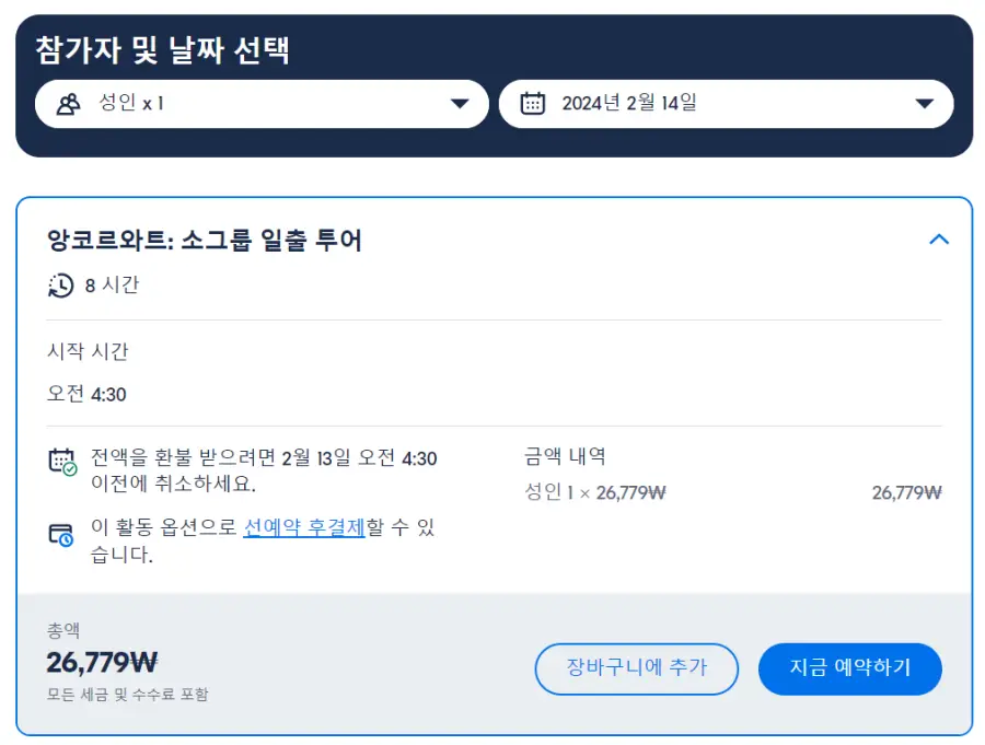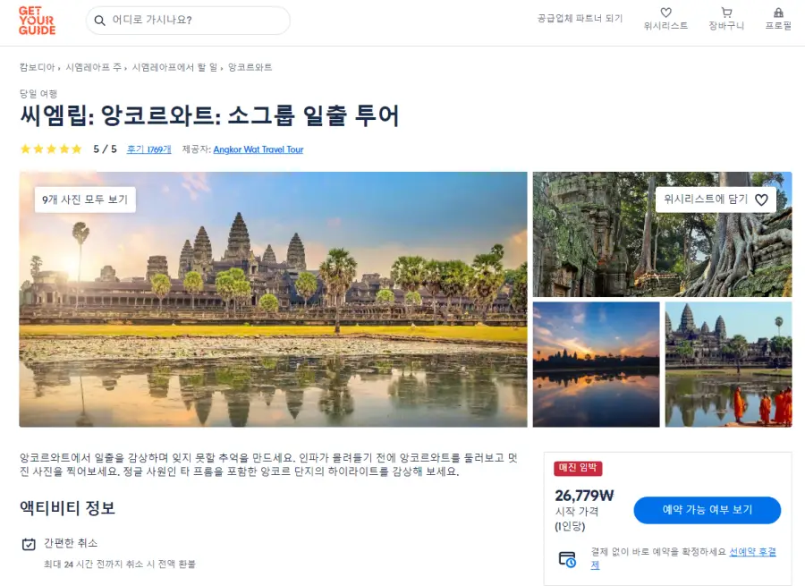 씨엠립여행의 앙코르와트 일출 현지투어는 GET YOUR GUIDE 사이트에서 예약하실 수 있습니다. 사이트는 특히 전세계 대부분의 나라, 지역의 투어, 교통편 있어, 쉽게 찾을 수 없는 여행지의 다양한 투어 및 서비스를 이용할 수 있는 글로벌 사이트로 한국어사이트는 지원하지 않습니다. (글로벌 한국어 여행사이트를 찾으신다면 klook 여행사이트 추천합니다. 함께 사용하시면 더욱 편하게 여행하실 수 있습니다. klook에 찾는 정보가 없다면 GET YOUR GUIDE에서 찾으시면 됩니다.)