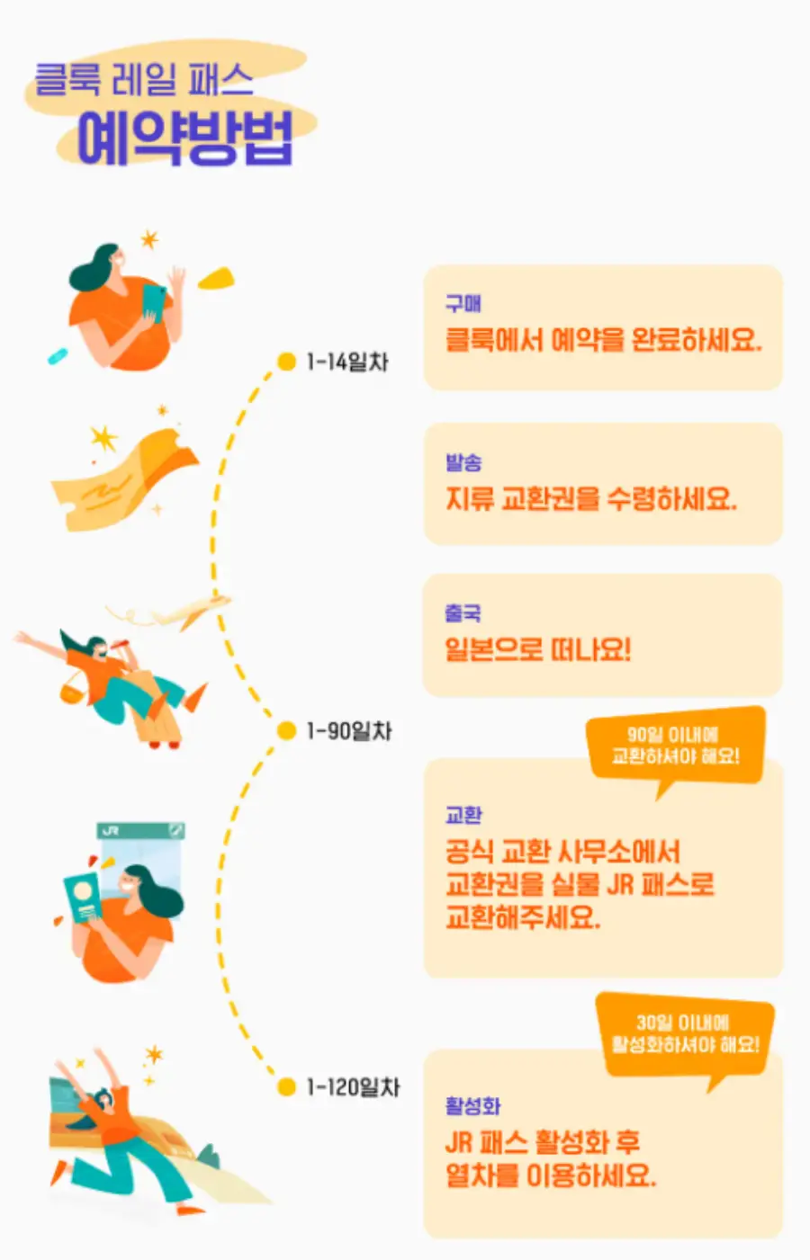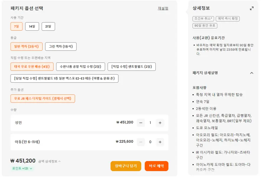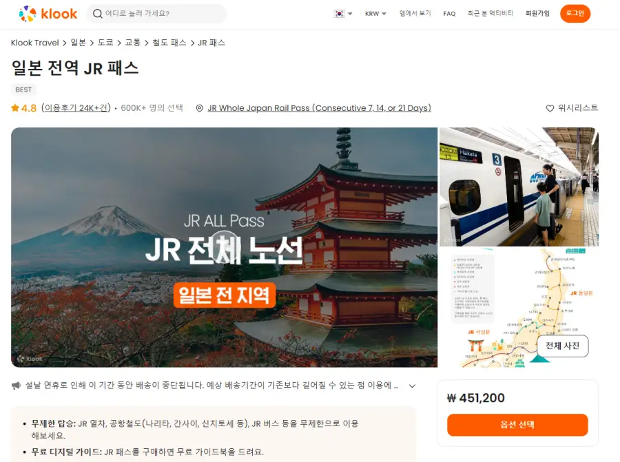 일본 전역 JR 패스는 클룩사이트에서 쉽게 예약하실 수 있으며, 현재 할인된 금액에 이용하실 수 있습니다. 내용 및 요금은 항상 변경될 수 있으니 예약사이트에서 정확한 내용을 확인하셔야 합니다.