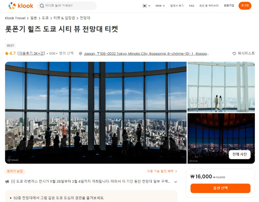 롯폰기 힐즈 도쿄 시티 뷰 전망대 티켓은 클룩사이트에서 쉽게 예약하실 수 있으며, 현재 할인된 금액에 이용하실 수 있습니다. 내용 및 요금은 항상 변경될 수 있으니 예약사이트에서 정확한 내용을 확인하셔야 합니다.