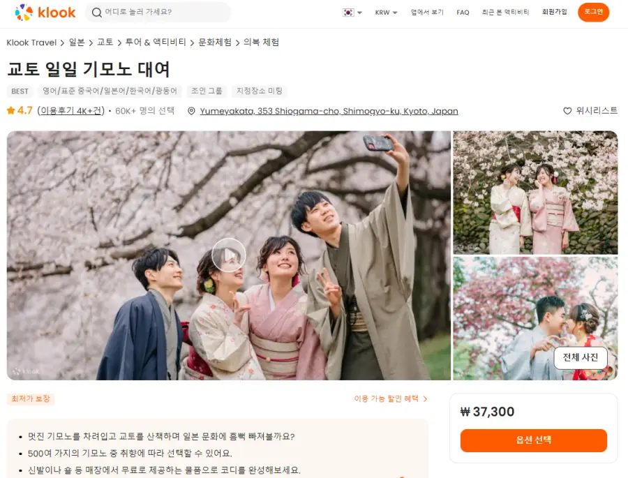 교토 일일 기모노 대여 예약은 클룩사이트에서 쉽게 예약하실 수 있으며, 현재 할인된 금액에 이용하실 수 있습니다. 내용 및 요금은 항상 변경될 수 있으니 예약사이트에서 정확한 내용을 확인하셔야 합니다.