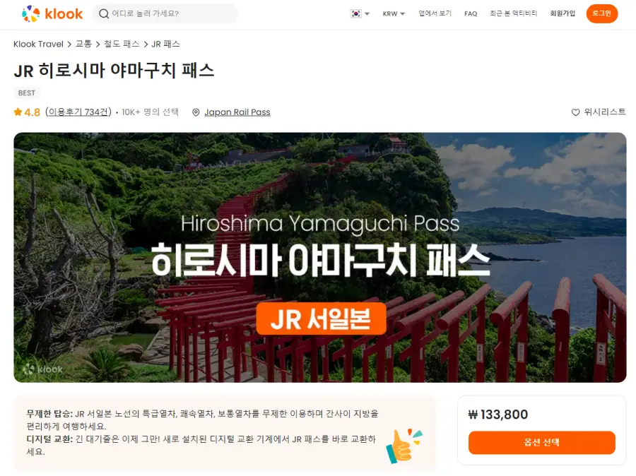 JR 히로시마 야마구치 패스는 클룩사이트에서 쉽게 예약하실 수 있으며, 현재 할인된 금액에 이용하실 수 있습니다. 내용 및 요금은 항상 변경될 수 있으니 예약사이트에서 정확한 내용을 확인하셔야 합니다.