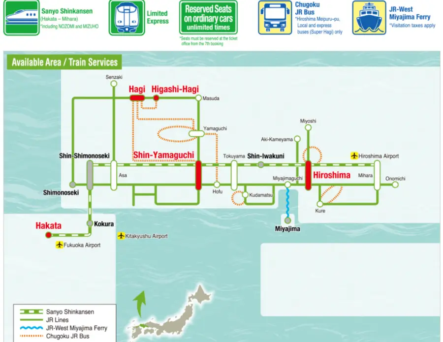 이 패스를 사용하면 JR 서부의 모든 일반 열차와 새칸센을 이용할 수 있으며, 또한 일부 버스 노선도 이용 가능합니다. 히로시마와 야마구치 지역의 관광지뿐만 아니라, 이 지역의 쇼핑, 식사, 숙박 등 다양한 활동을 즐길 수 있습니다.