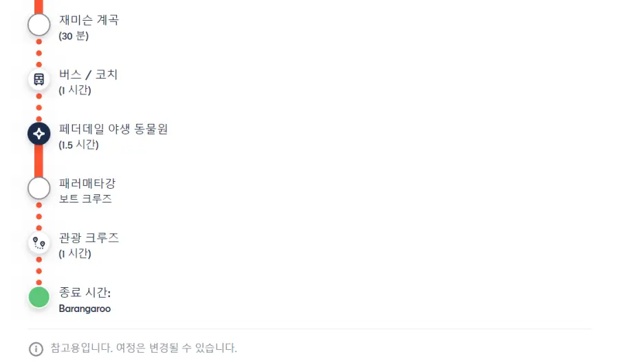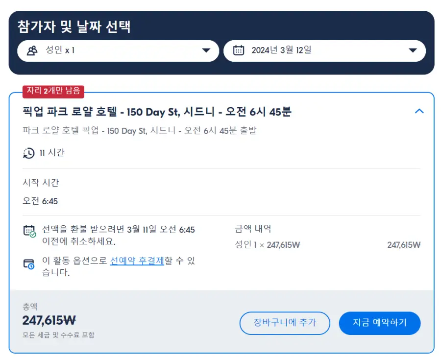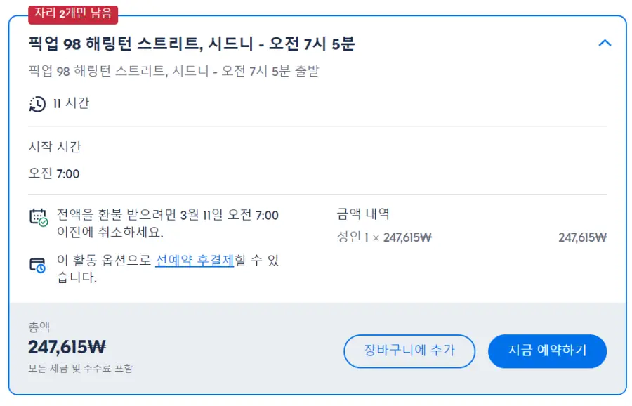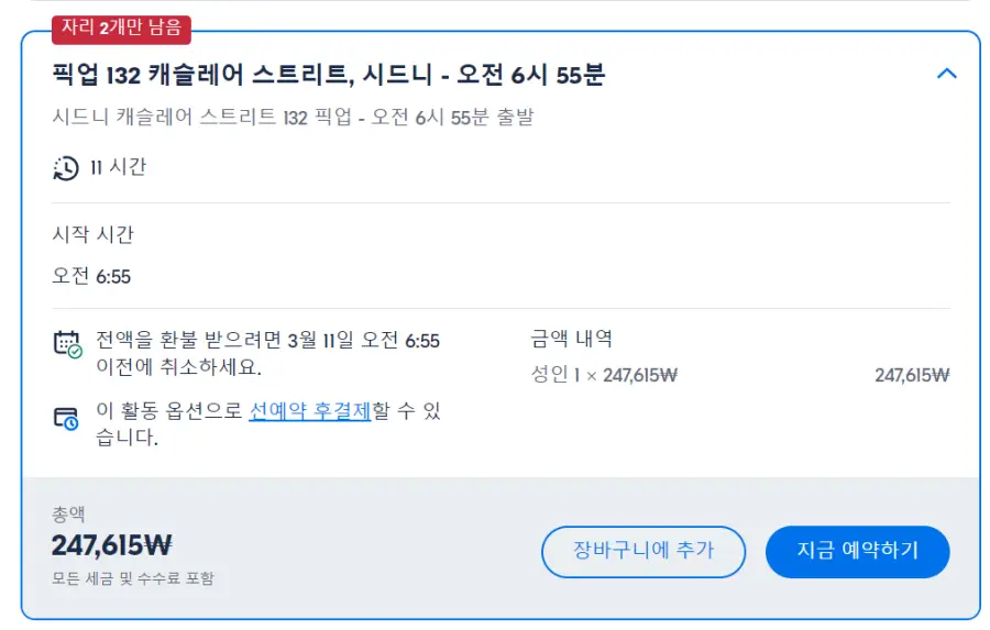 오전 6시 55분 출발: 132 캐슬레어 스트리트, 시드니 출발 15분 전까지 도착해 주세요.