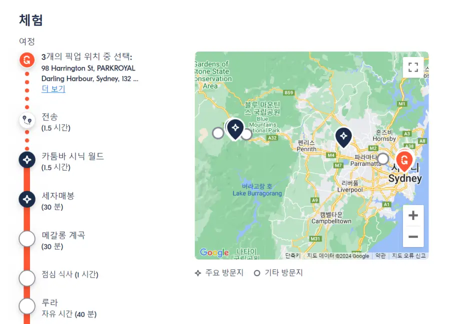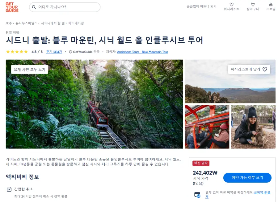시드니에서 출발하는 블루마운틴 현지투어는 GET YOUR GUIDE 사이트에서 예약하실 수 있습니다. 사이트는 특히 전세계 대부분의 나라, 지역의 투어, 교통편 있어, 쉽게 찾을 수 없는 여행지의 다양한 투어 및 서비스를 이용할 수 있는 글로벌 사이트로 한국어사이트는 지원하지 않습니다. (글로벌 한국어 여행사이트를 찾으신다면 klook 여행사이트 추천합니다. 함께 사용하시면 더욱 편하게 여행하실 수 있습니다. klook에 찾는 정보가 없다면 GET YOUR GUIDE에서 찾으시면 됩니다.)