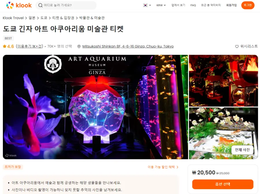 도쿄 긴자 아트 아쿠아리움 미술관 입장권은 클룩사이트에서 쉽게 예약하실 수 있으며, 현재 할인된 금액에 이용하실 수 있습니다. 내용 및 요금은 항상 변경될 수 있으니 예약사이트에서 정확한 내용을 확인하셔야 합니다.