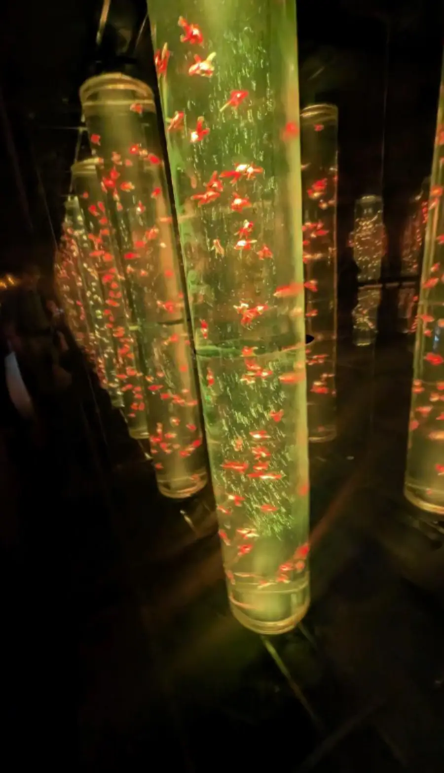 이 작품은 금붕어를 다양한 각도에서 관찰할 수 있게 하는 투명한 수조와, 그 안에서 헤엄치는 금붕어를 다양한 색의 조명으로 비추어 아름다운 풍경을 연출합니다. 또한, 음악과 함께 이루어지는 금붕어의 움직임은 마치 물 아래에서 춤을 추는 것 같아 방문객들에게 아름다운 시각적 경험을 제공합니다.