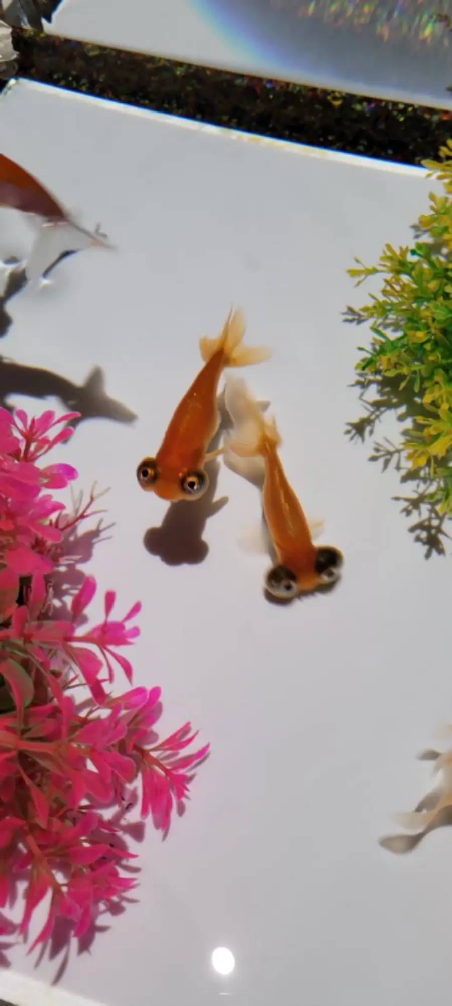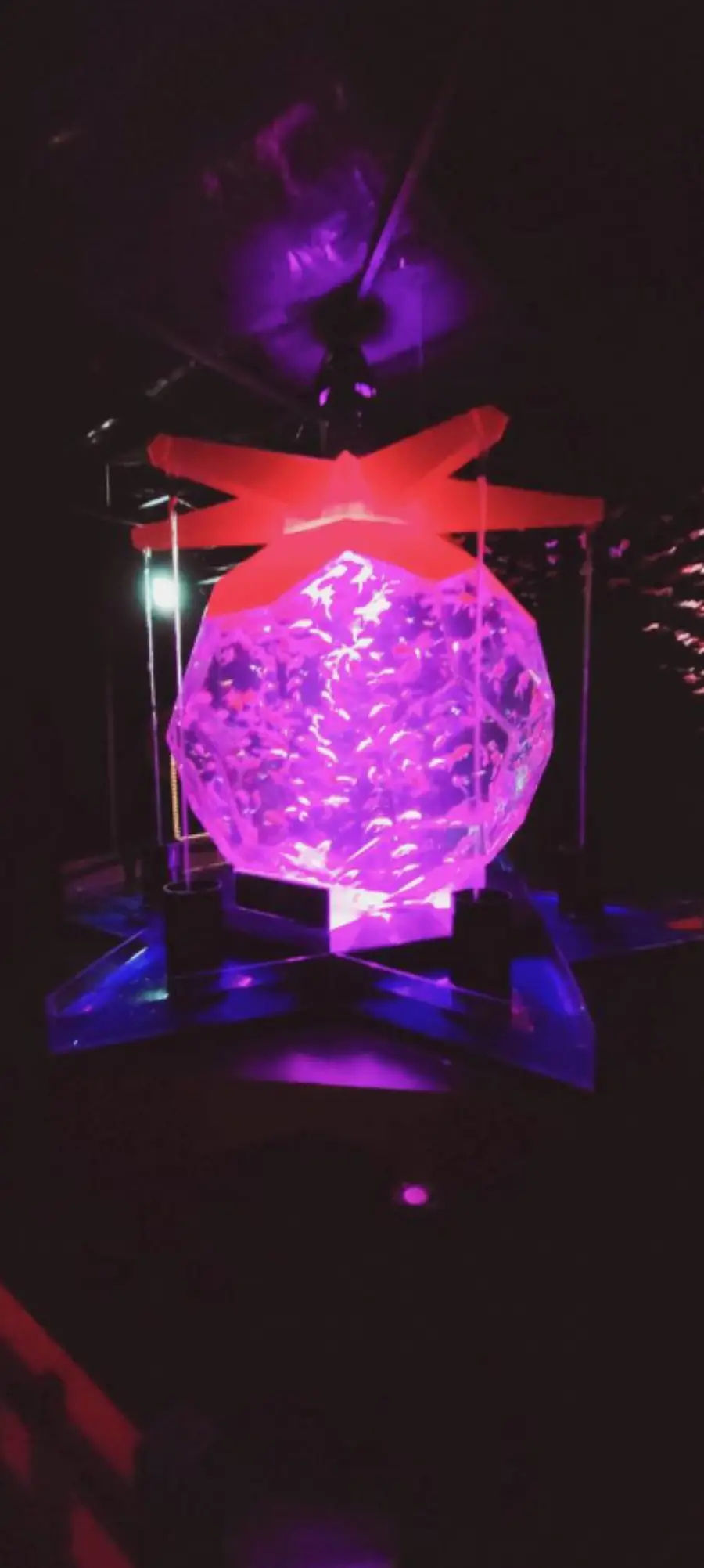 조명은 금붕어의 색깔과 움직임을 돋보이게 하는 데 중요한 역할을 합니다. 이 작품에서는 다양한 색의 조명이 사용되어, 금붕어가 헤엄치는 모습을 다양한 방식으로 표현하고 있습니다. 또한, 조명은 수조 안의 금붕어를 강조하고, 그 주변을 어둡게 만들어 금붕어가 더욱 돋보이게 합니다.