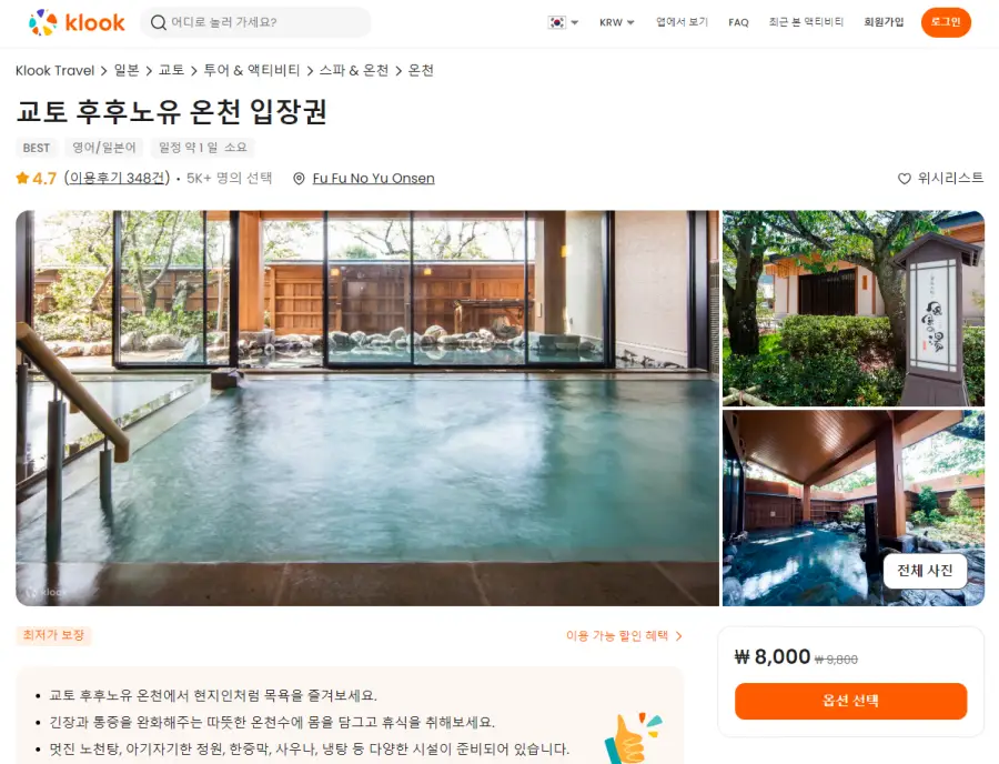 교토 후후노유 온천 클룩사이트에서 쉽게 예약하실 수 있으며, 현재 할인된 금액에 이용하실 수 있습니다. 내용 및 요금은 항상 변경될 수 있으니 예약사이트에서 정확한 내용을 확인하셔야 합니다.