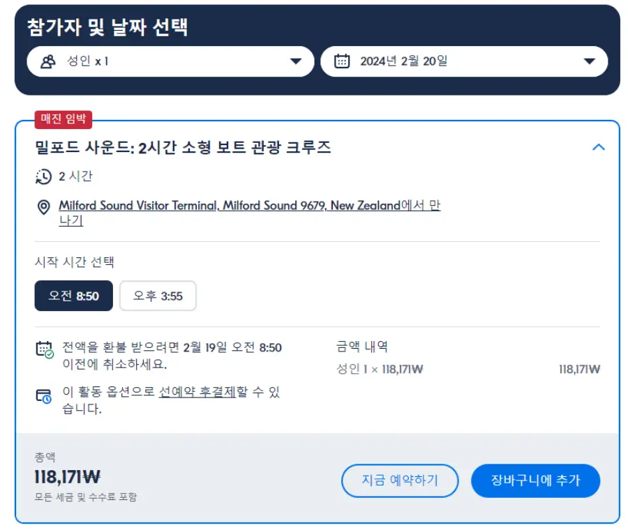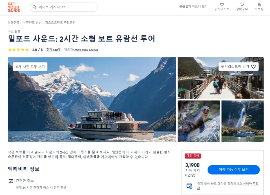 밀포드 사운드 2시간 소형 보트 유람선 현지투어는 GET YOUR GUIDE 사이트에서 예약하실 수 있습니다. 사이트는 특히 전세계 대부분의 나라, 지역의 투어, 교통편 있어, 쉽게 찾을 수 없는 여행지의 다양한 투어 및 서비스를 이용할 수 있는 글로벌 사이트로 한국어사이트는 지원하지 않습니다. (글로벌 한국어 여행사이트를 찾으신다면 klook 여행사이트 추천합니다. 함께 사용하시면 더욱 편하게 여행하실 수 있습니다. klook에 찾는 정보가 없다면 GET YOUR GUIDE에서 찾으시면 됩니다.)
