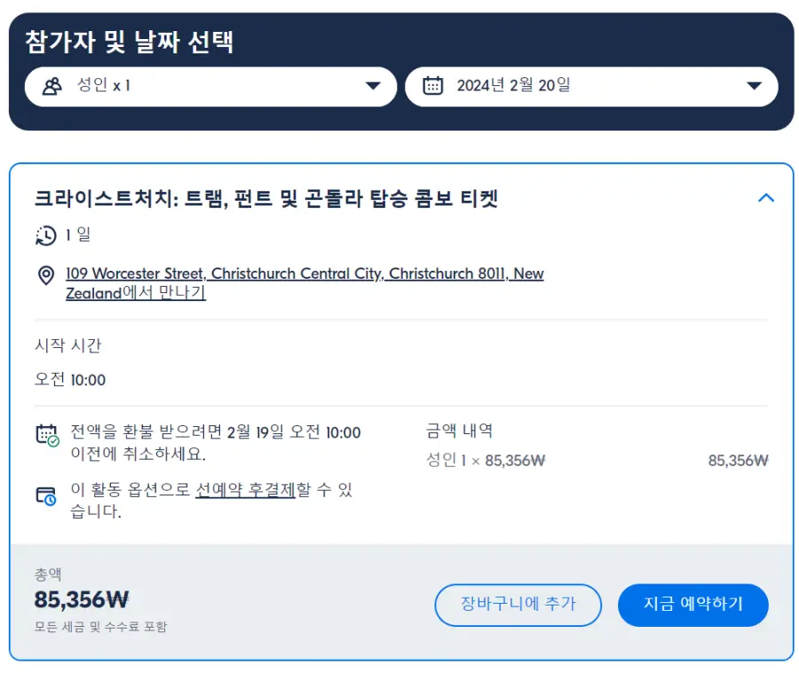 크라이스트처치 트램, 펀트 및 곤돌라 탑승 콤보 티켓은 GET YOUR GUIDE 사이트에서 예약하실 수 있습니다. 사이트는 특히 전세계 대부분의 나라, 지역의 투어, 교통편 있어, 쉽게 찾을 수 없는 여행지의 다양한 투어 및 서비스를 이용할 수 있는 글로벌 사이트로 한국어사이트는 지원하지 않습니다. (글로벌 한국어 여행사이트를 찾으신다면 klook 여행사이트 추천합니다. 함께 사용하시면 더욱 편하게 여행하실 수 있습니다. klook에 찾는 정보가 없다면 GET YOUR GUIDE에서 찾으시면 됩니다.)
