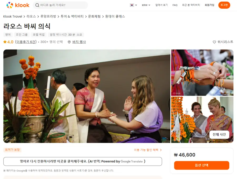 루앙프라방여행 라오스 바씨 의식 체험 현지투어는 클룩사이트에서 쉽게 예약하실 수 있으며, 현재 할인된 금액에 이용하실 수 있습니다. 내용 및 요금은 항상 변경될 수 있으니 예약사이트에서 정확한 내용을 확인하셔야 합니다.