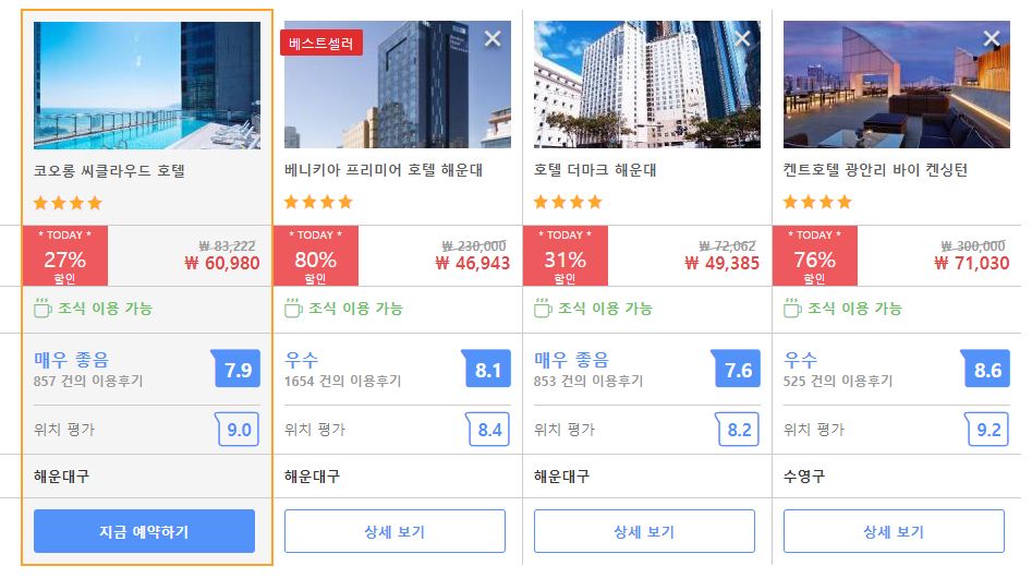 전망 좋고, 관광지 가깝고, 거기다 넓고 저렴 함. 100점 만점에 95점(마이너스 5점은 조식뷔페에 베이컨 없음). 부산여행객에제 추천