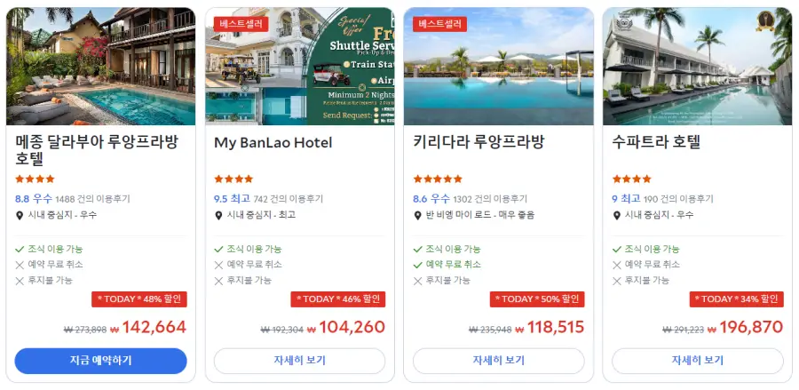 메종 달라부아 루앙프라방 호텔 (Maison Dalabua Luangprabang Hotel)의 최저 가격대는 아고다웹사이트에서 할인특가 가격으로 매일매일 변동되며 10만원대부터 다양하게 형성됩니다. 날짜별로 매일 가격이 다르므로 아고다웹사이트 최저가를 확인하시려면 아래 링크를 누르시고 원하는 날짜의 가격대를 선택해야 정확한 가격을 자세히 보실 수 있습니다.
