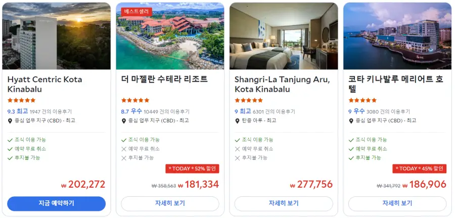 코타키나발루 국제공항과 가까우며, 쇼핑몰(이마고몰)도 바로 옆에 있어 편리한 코타키나발루 더 마젤란 수테라 리조트(The Magellan Sutera)는 규모가 무척 크며 수영장의 종류도 많아 즐기기에 불