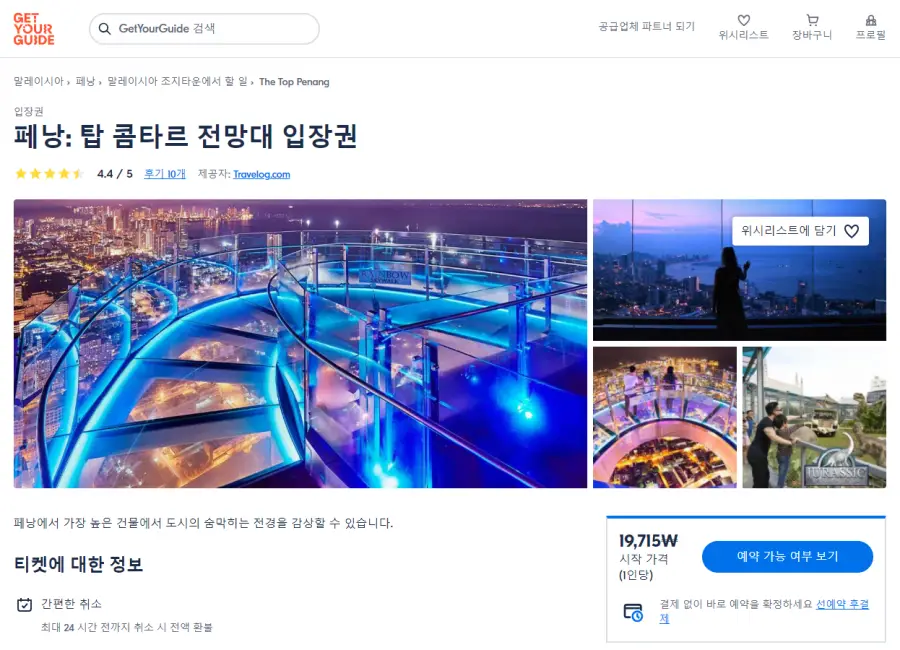 페낭 탑 콤타르 전망대 입장권은 GET YOUR GUIDE 사이트에서 예약하실 수 있습니다. 사이트는 특히 전세계 대부분의 나라, 지역의 투어, 교통편 있어, 쉽게 찾을 수 없는 여행지의 다양한 투어 및 서비스를 이용할 수 있는 글로벌 사이트로 한국어사이트는 지원하지 않습니다. (글로벌 한국어 여행사이트를 찾으신다면 klook 여행사이트 추천합니다. 함께 사용하시면 더욱 편하게 여행하실 수 있습니다. klook에 찾는 정보가 없다면 GET YOUR GUIDE에서 찾으시면 됩니다.)