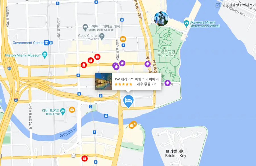 JW 메리어트 마퀴스 마이애미에서 가까운 관광지가 어디인가요?