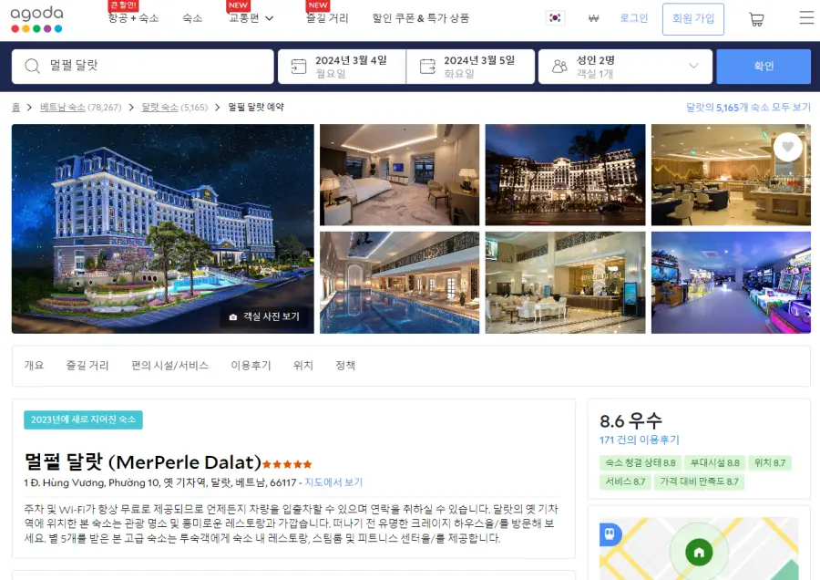 호텔 멀펄 달랏 (MerPerle Dalat)의 최저 가격대는 아고다웹사이트에서 할인특가 가격으로 매일매일 변동되며 10만원대부터 다양하게 형성됩니다. 날짜별로 매일 가격이 다르므로 아고다웹사이트 최저가를 확인하시려면 아래 링크를 누르시고 원하는 날짜의 가격대를 선택해야 정확한 가격을 자세히 보실 수 있습니다.