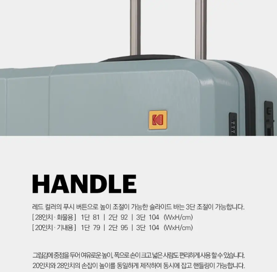 이상이 코닥캐리어 20인치와 28인치 캐리어에 대한 정보입니다. 이 캐리어들은 사용자의 여행을 더욱 편리하고 즐겁게 만들어 줄 수 있는 아이템이므로, 선물로도 좋은 선택이 될 것입니다.