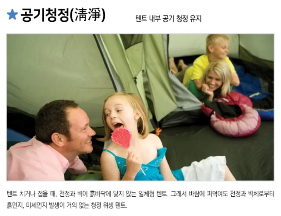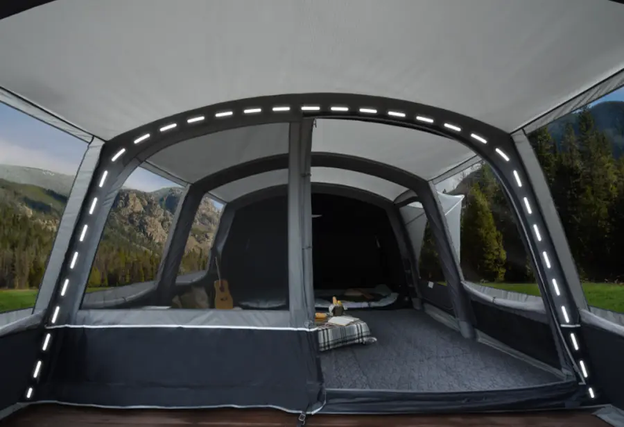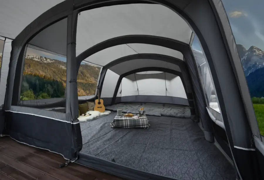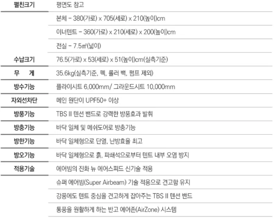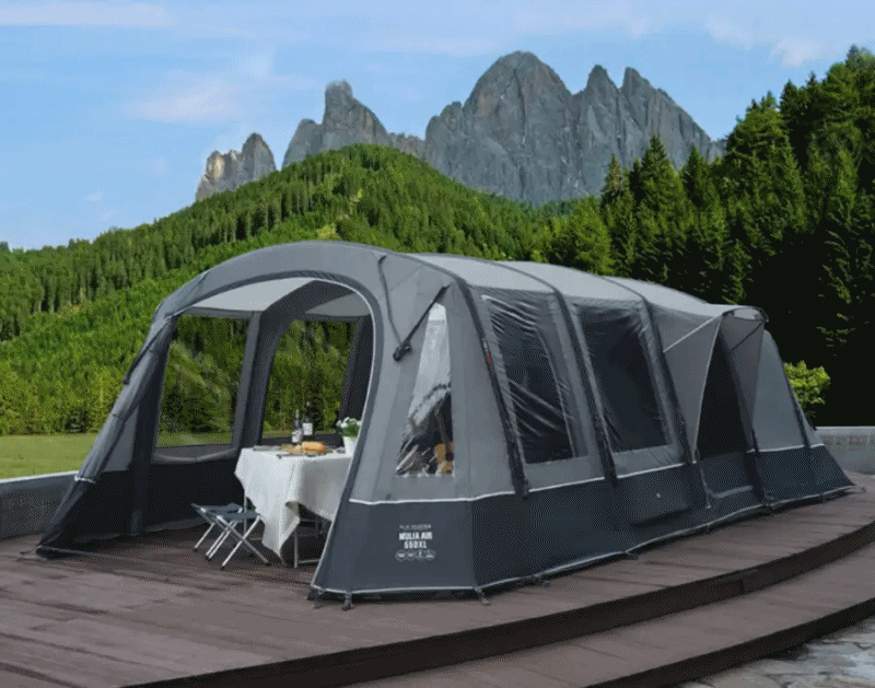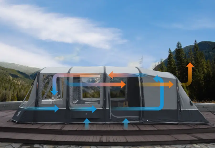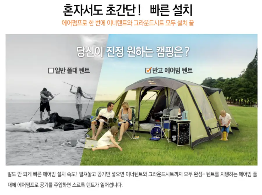 에어텐트: 전통적인 텐트보다 훨씬 빠르고 간편하게 설치할 수 있는 에어텐트입니다. 포함된 펌프를 이용해 공기를 주입함으로써 쉽게 텐트를 세울 수 있습니다. 이는 특히 캠핑 초보자들에게 큰 도움이 됩니다.