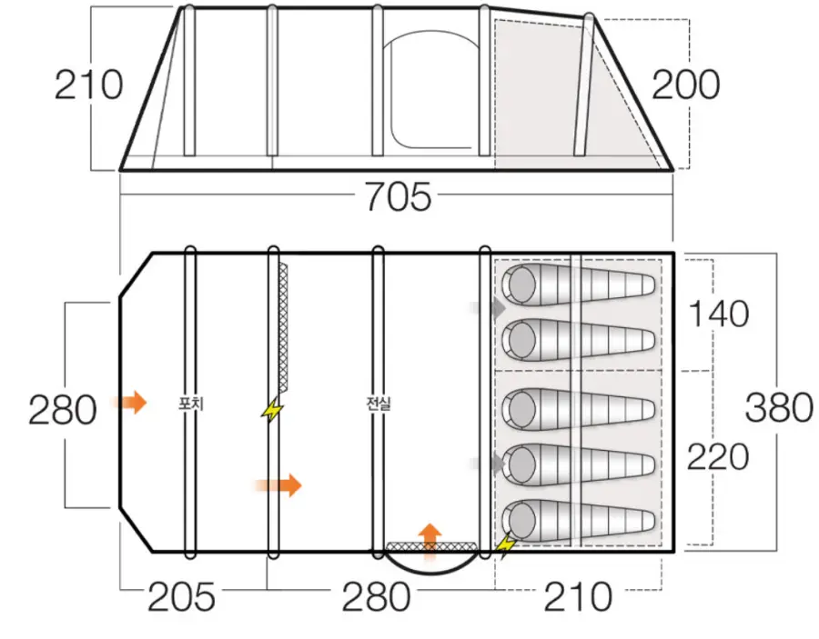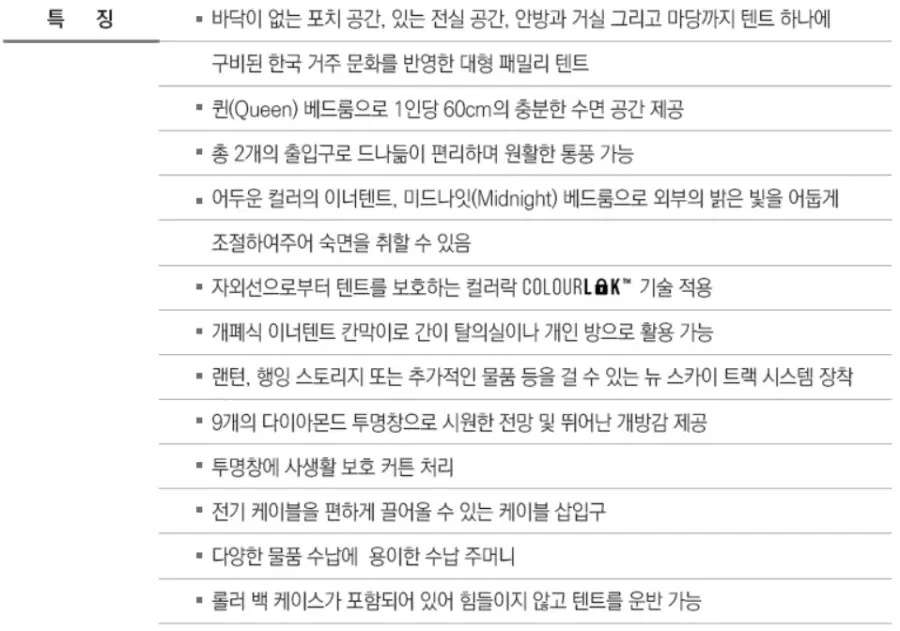 공간: 이 텐트는 최대 5~6명까지 수용 가능한 넓은 공간을 제공하여, 대가족이나 친구들과 함께 캠핑을 즐기기에 적합합니다. 개별적인 침실과 넓은 거실 공간을 제공하여, 쾌적하고 편안한 캠핑 경험을 즐길 수 있습니다.