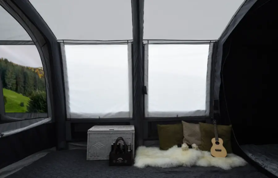 반고 뮬리아 550XL 클라우드 그레이 에어텐트의 내부 공간도 매우 넓고 편안합니다. 내부에는 여러 사람이 편하게 머물 수 있는 충분한 공간이 마련되어 있으며, 개별적인 침실과 넓은 거실 공간을 제공합니다. 이로써 이 텐트에서는 마치 집에서 머무는 것처럼 쾌적하고 편안한 캠핑 경험을 즐길 수 있습니다.