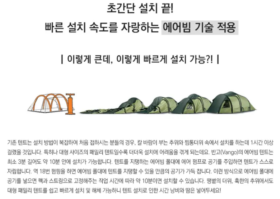 이는 제품에 포함된 펌프를 이용해 공기를 주입함으로써 가능합니다. 펌프를 이용해 에어텐트의 공기 주입구에 공기를 넣으면, 그 공기가 텐트의 골격을 이루는 에어빔을 부풀려 텐트를 세울 수 있습니다. 이 과정은 매우 간단하며, 복잡한 고정 장치나 많은 시간이 필요하지 않습니다.