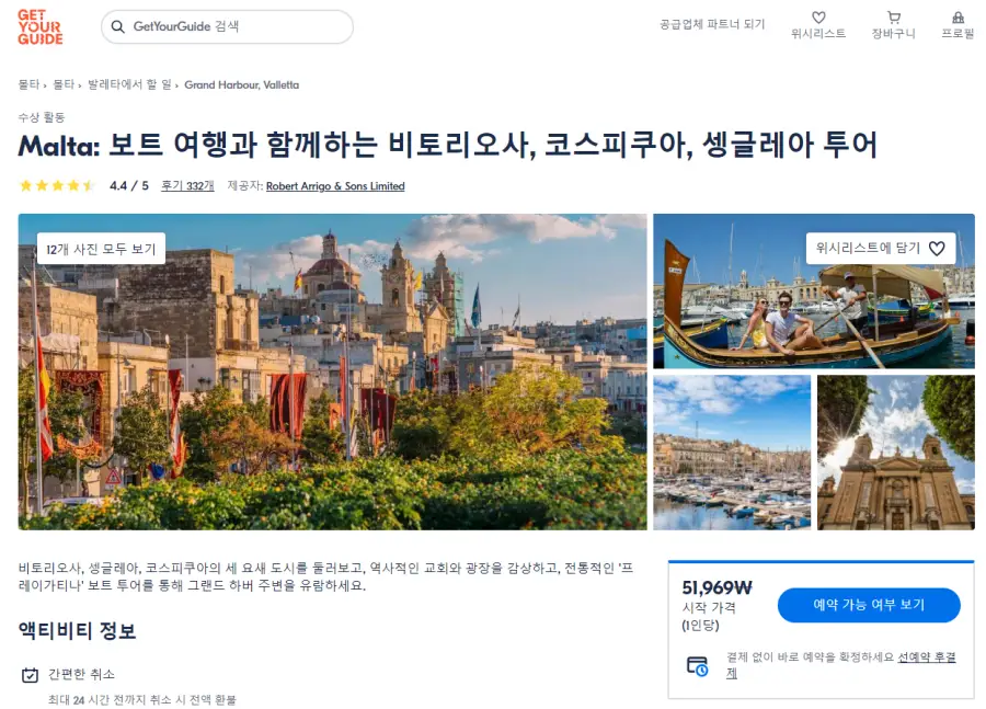 몰타 발레타출발 비토리오사, 코스피쿠아, 셍글레아 현지투어는 GET YOUR GUIDE 사이트에서 예약하실 수 있습니다. 사이트는 특히 전세계 대부분의 나라, 지역의 투어, 교통편 있어, 쉽게 찾을 수 없는 여행지의 다양한 투어 및 서비스를 이용할 수 있는 글로벌 사이트로 한국어사이트는 지원하지 않습니다. (글로벌 한국어 여행사이트를 찾으신다면 klook 여행사이트 추천합니다. 함께 사용하시면 더욱 편하게 여행하실 수 있습니다. klook에 찾는 정보가 없다면 GET YOUR GUIDE에서 찾으시면 됩니다.)