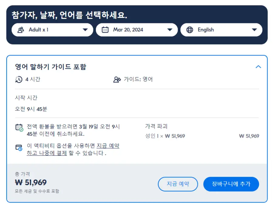 그리고 한국인들이 많이 참여하는 투어보다 다양한 나라의 사람들이 많이 참여하는 만큼 다른사람들 시선을 신경쓰지 않고 편하게 여행을 즐기길 원하는 사람들에게 더욱 추천합니다. 한국어로 쉽게 예약할 수 있고 한국분들이 많이 참여하는 투어는 klook 여행사이트에 예약하시고 한국분들 많이 참여하지 않는 현지투어의 분위기를 좋아하시는 분들은 GET YOUR GUIDE에 예약하시면 됩니다.